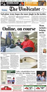 I first caught a glance of today’s Vindicator at a gas station this morning. I was on my way to interview a local Santa impersonator and was already excited about that. When I saw that I had three of four bylines on the front page, I almost forgot it was a Monday.