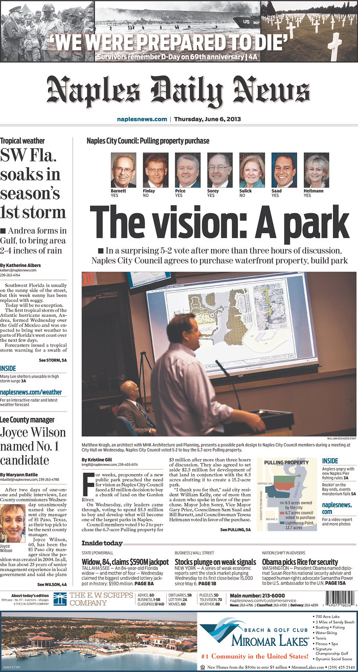 Naples City Council almost did just that. But as it turns out, Wednesday’s meeting was a little more exciting. Here’s my front page article about the purchase of a large riverfront property the city plans to turn into a park after pressure from residents.
