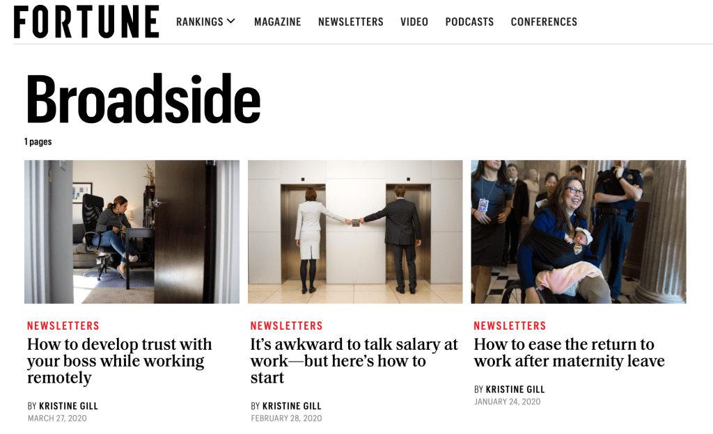 In January, I was tapped to write a monthly newsletter for mid-career professional women. The Broadside comes out on the fourth Friday of each month. It features an essay on a topic women in our career phase are facing, followed by actionable tips from experts. At the end of each newsletter, we provide links to a handful of jobs across the country as well as a curated list of upcoming events and opportunities.